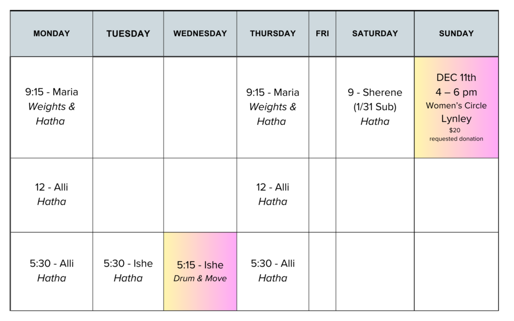 ~ Sunday, Jan. 11 (4-6): Women’s Circle with Lynley ([email protected]) ~ $20 Donation requested (Flyer on “Announcement” page)