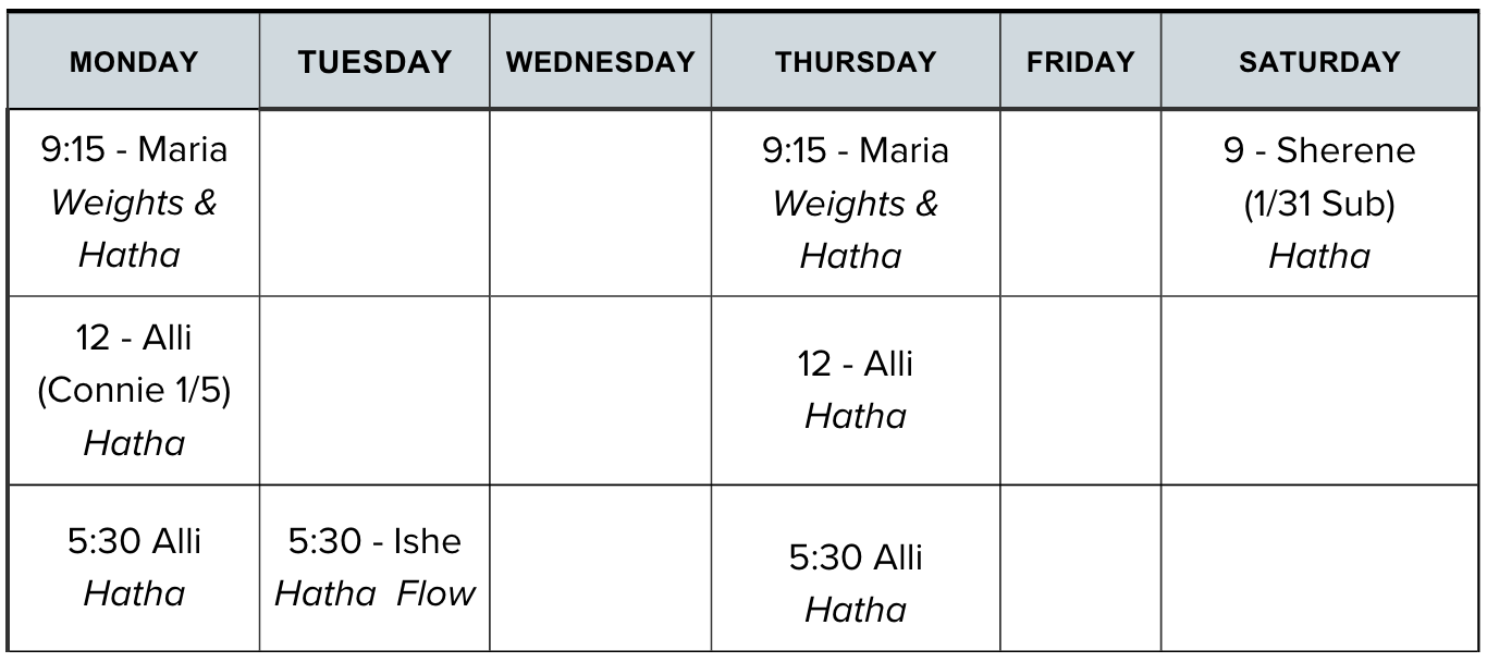 First Monday noon class is usually taught by Connie. Last Thursday of the month is restorative yoga at noon & 5:30. We are not currently offering pre-natal yoga.
